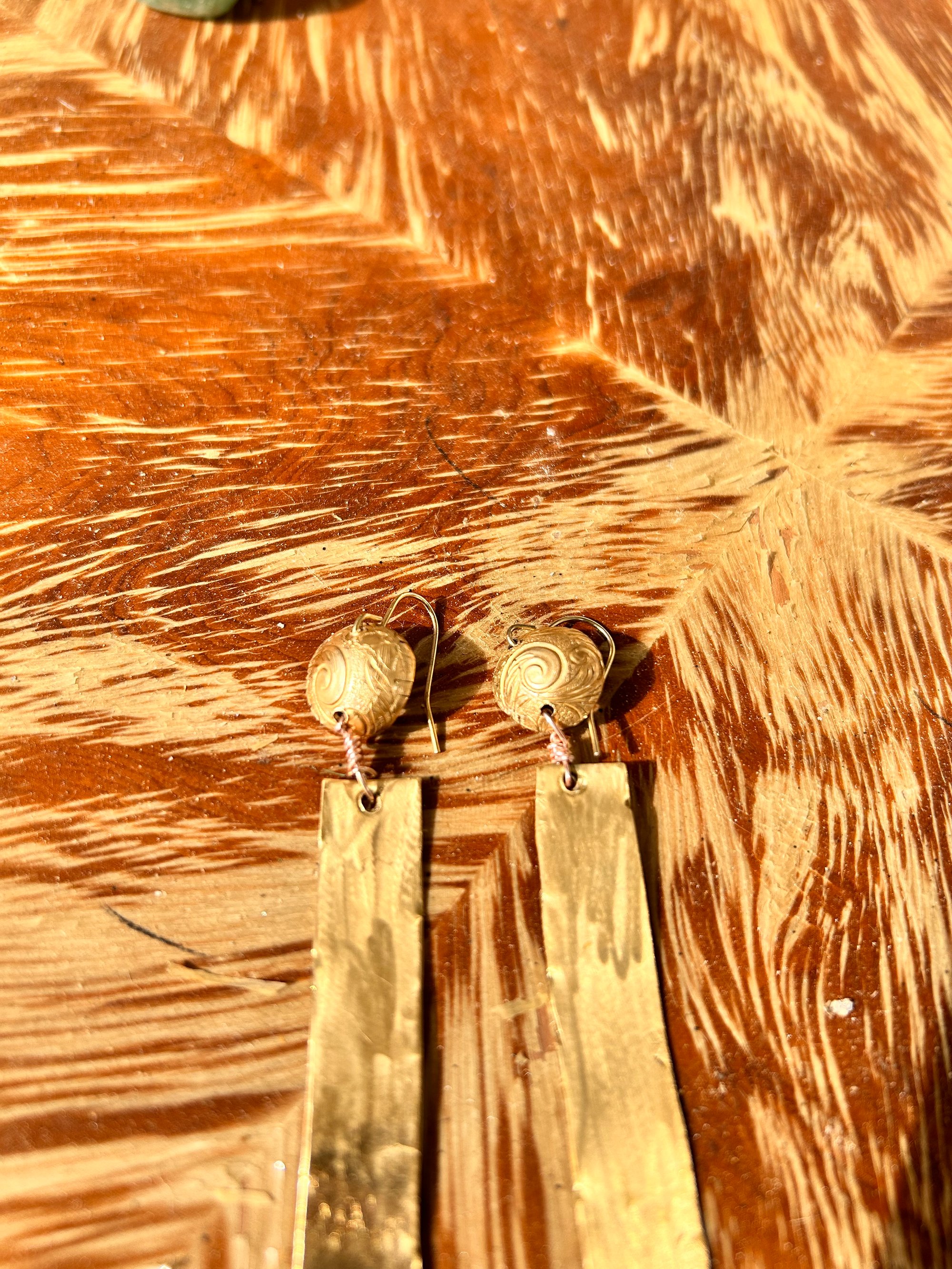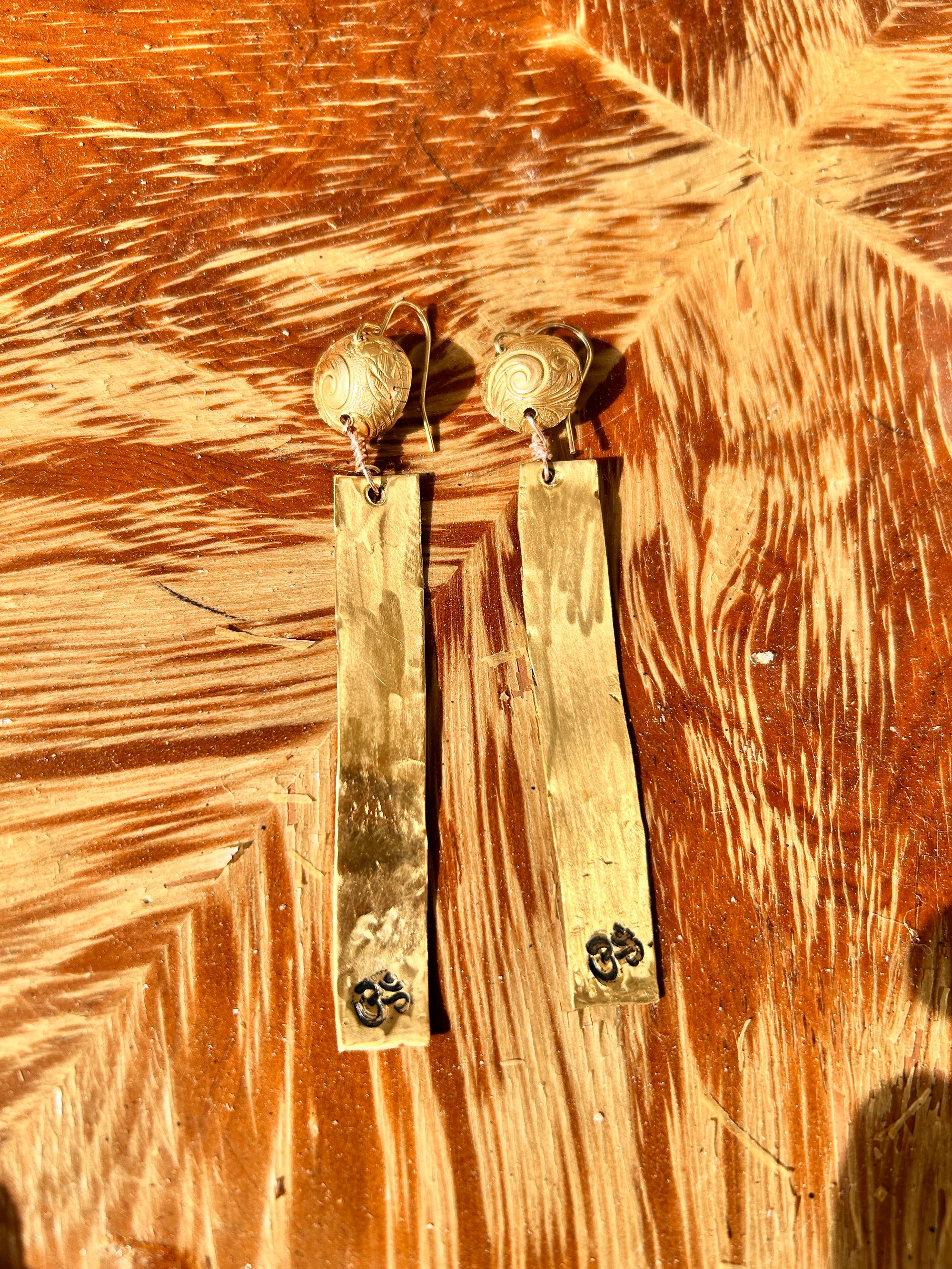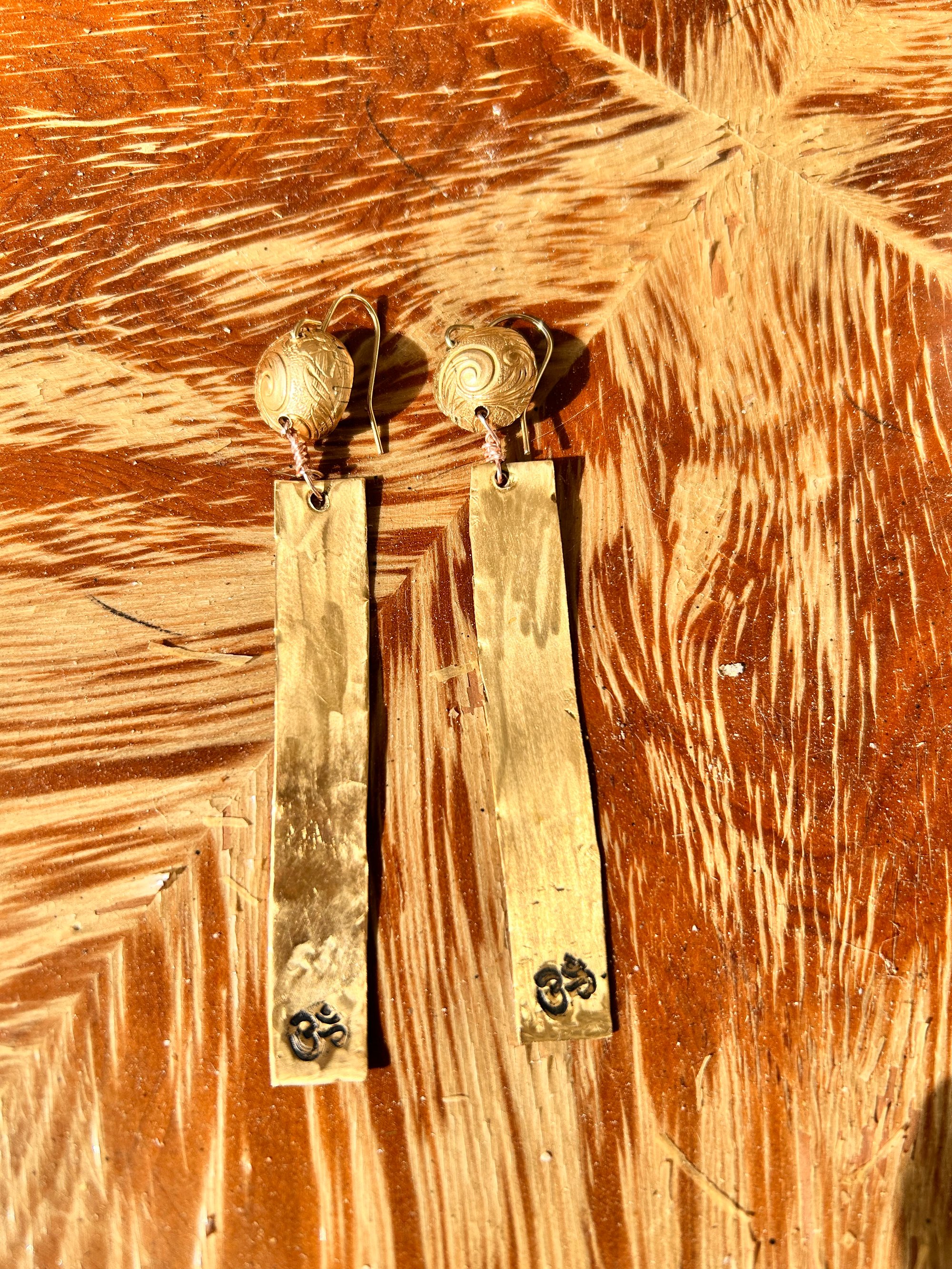 Hand stamped brass. Dome is patterned brass. Rose gold wire. Gold plated hooks. Om or Ohm is a sacred sound from Hinduism and Buddhism. A spiritual symbol that represents the primordial sound of the universe.