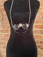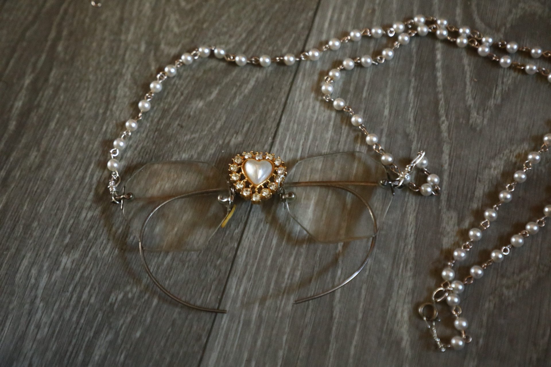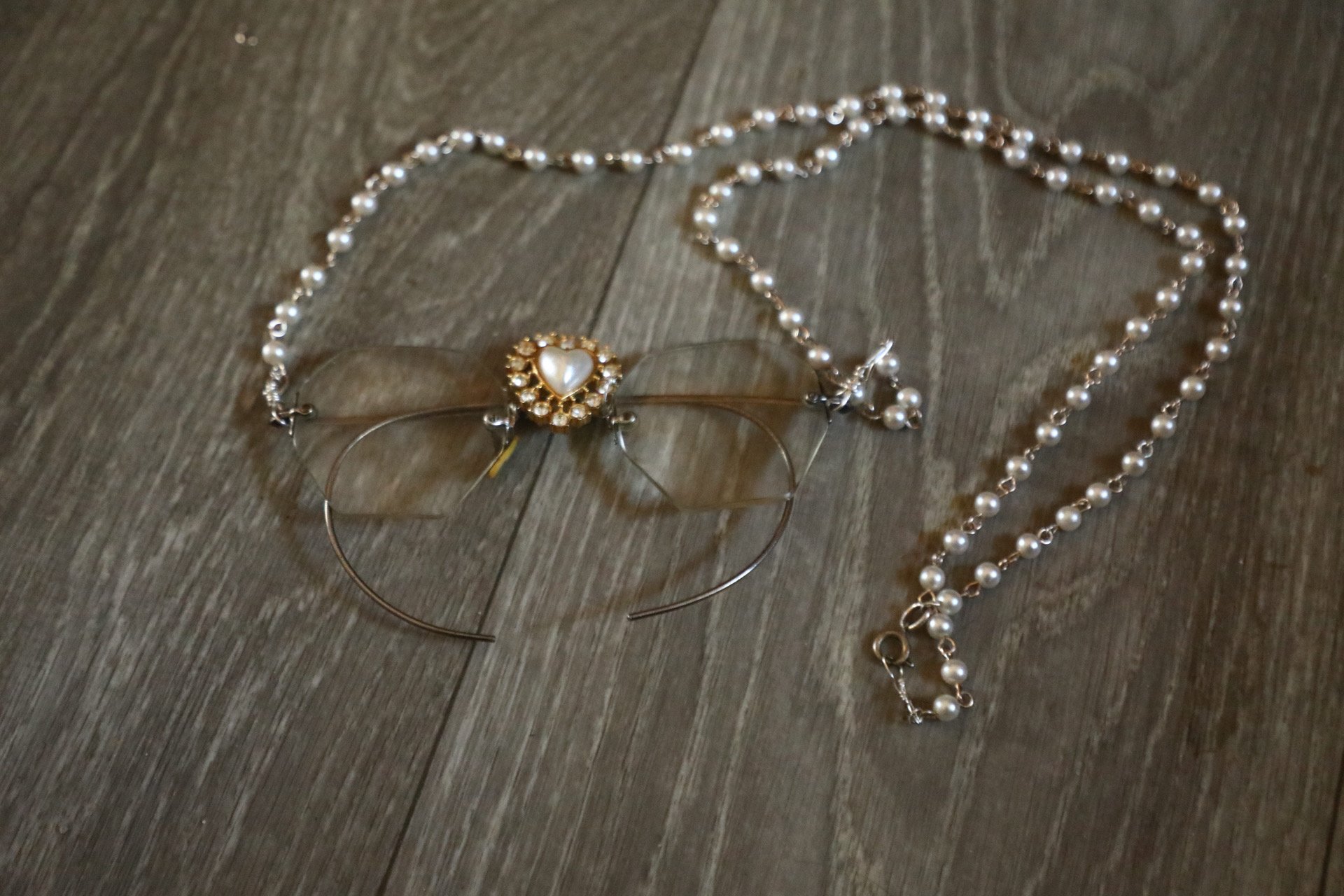 Antique glasses made into necklace. Not real pearls. Glasses can not unfold but if you would like them to be able to unfold. Send me a message or email when you order.